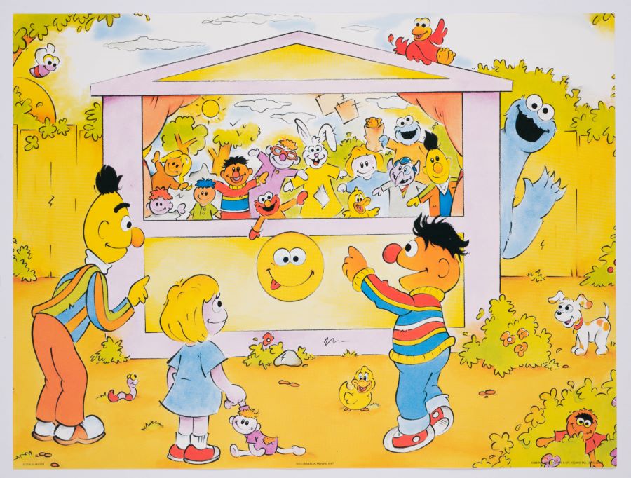 A limited edition Sesame Street Puppet Trip print. Featuring a charming illustration of Bert, and Ernie, and Cookie Monster watching a puppet show, published by Comic & Art. Measuring 12"x16", the lithograph is in fine condition.