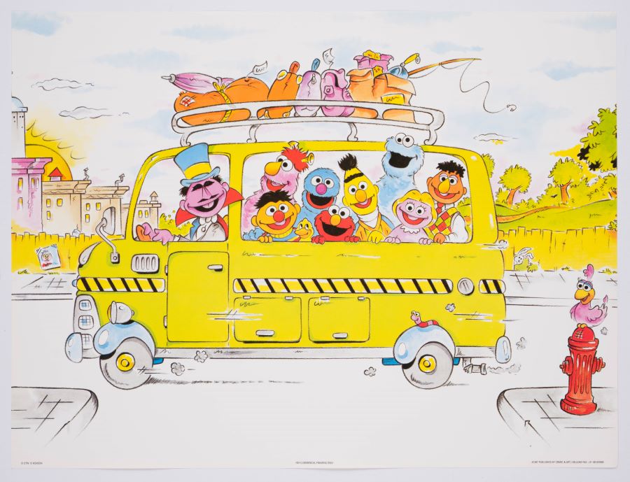 A limited edition Sesame Street Road Trip print. Featuring a charming illustration many beloved Sesame Street characters riding on a big yellow school bus, published by Comic & Art. Measuring 12"x16", the lithograph is in fine condition.