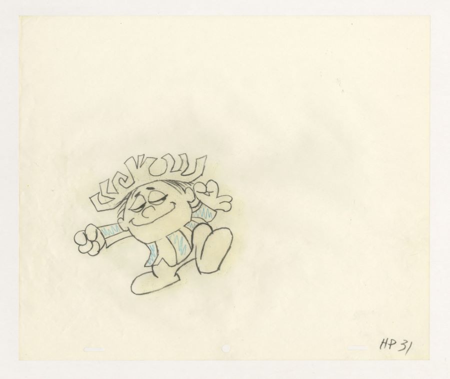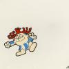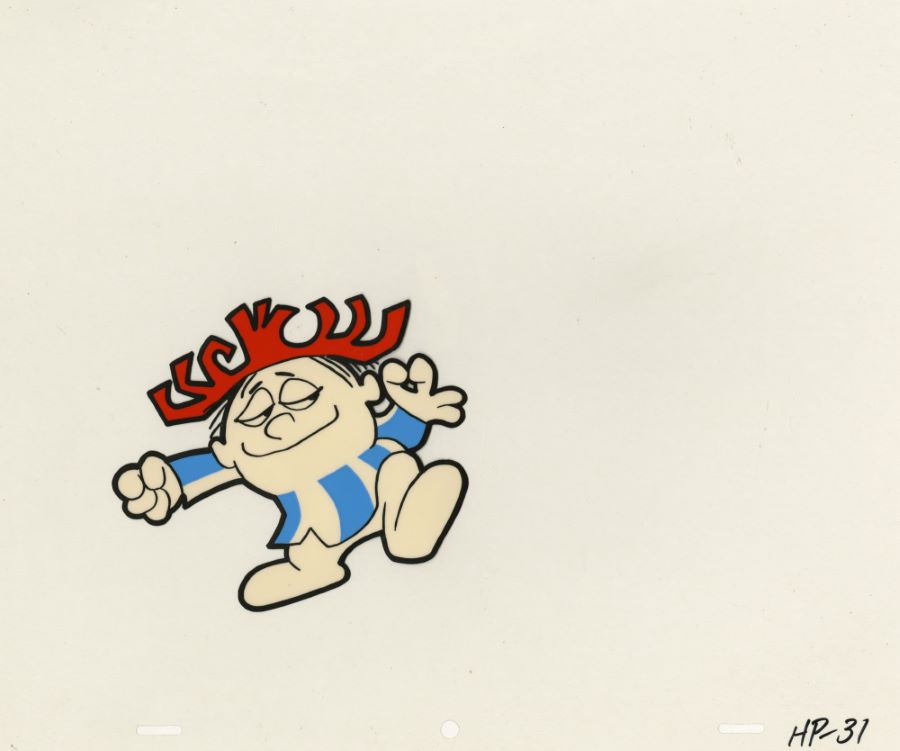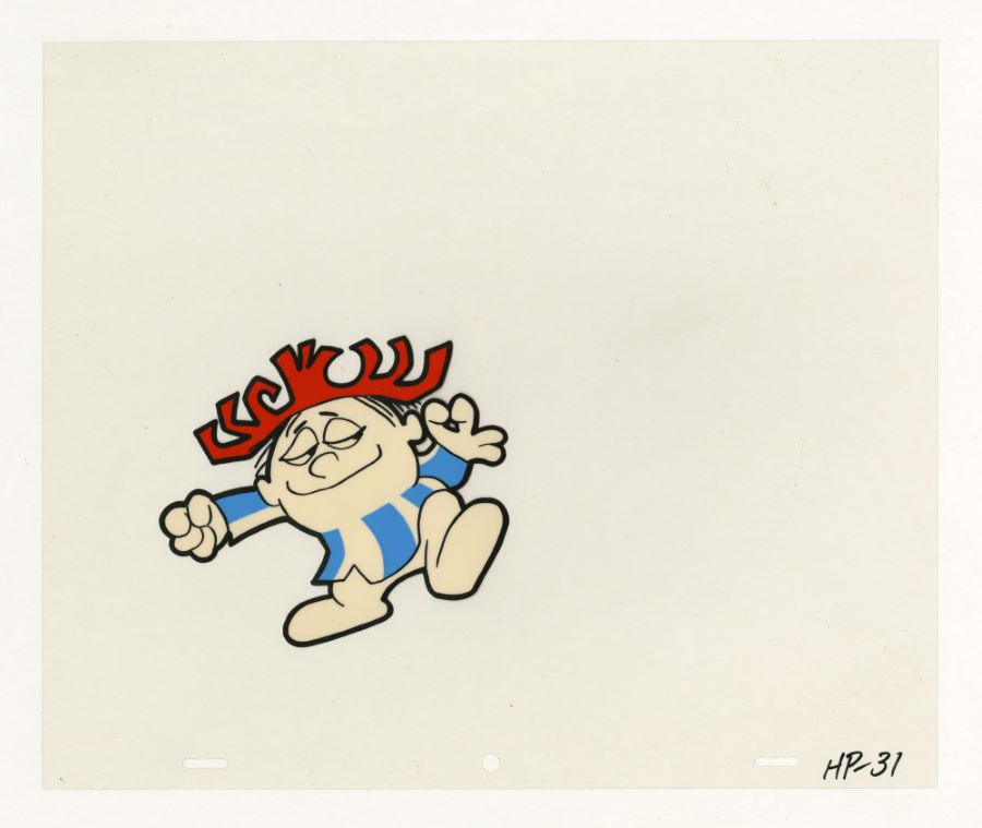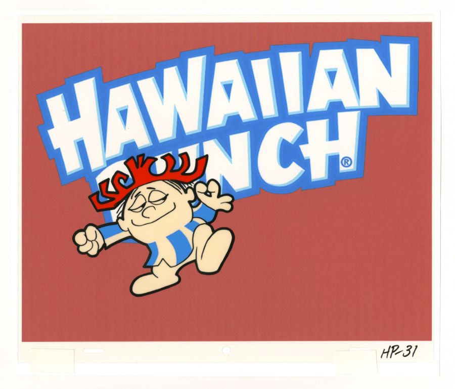 A production cel from a commercial for “Hawaiian Punch” (c.1990s). Featuring a vibrant image of the company’s sassy mascot Punchy, the hand-painted cel was created at Duck Soup Studios and used during the animation process. The piece is an actual frame of animation that was photographed and appears in the commercial. Measuring 10.5"x12.5" overall, with the character image measuring 4.5"x5", the cel is in fine condition with minimal line wear. The cel is paired with a color printed reproduction background and is accompanied by the matching production drawing.