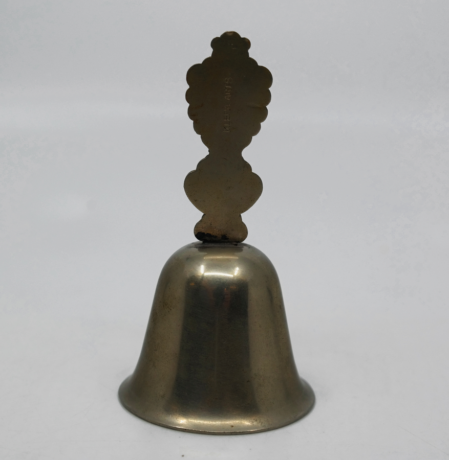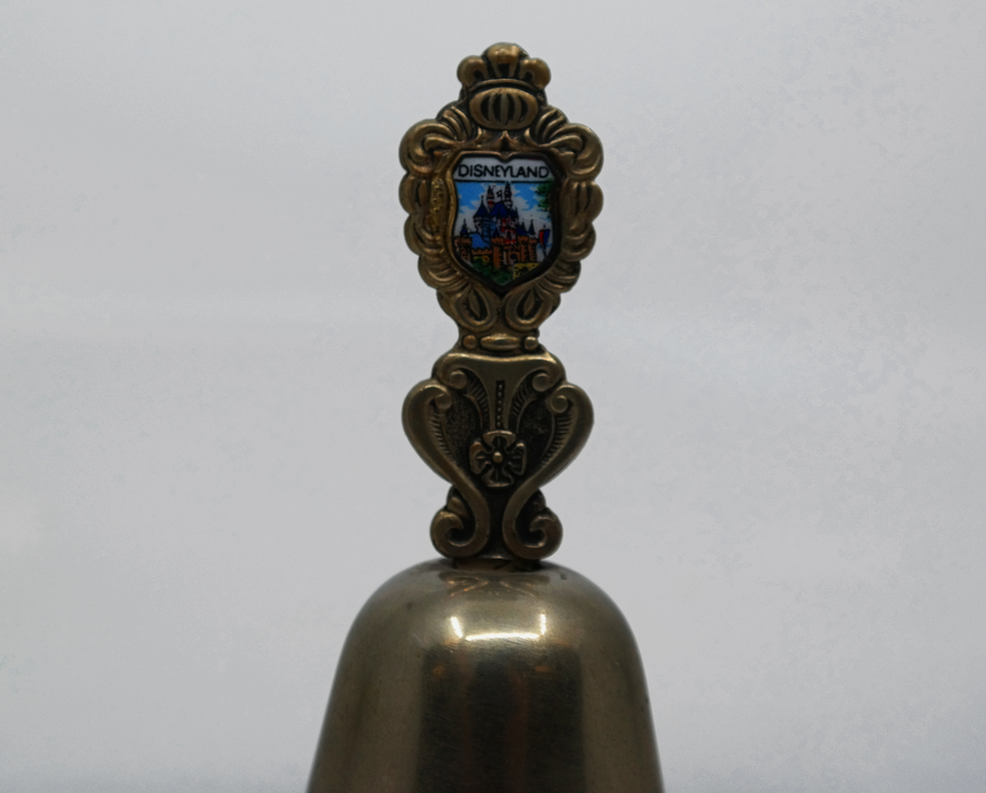 A vintage 1950s souvenir metal bell featuring an image of Sleeping Beauty Castle on the handle. The bell measures 2"x2"x3.5" and is in very good condition with light wear throughout.
