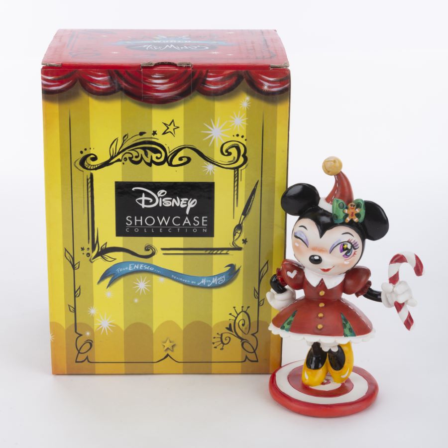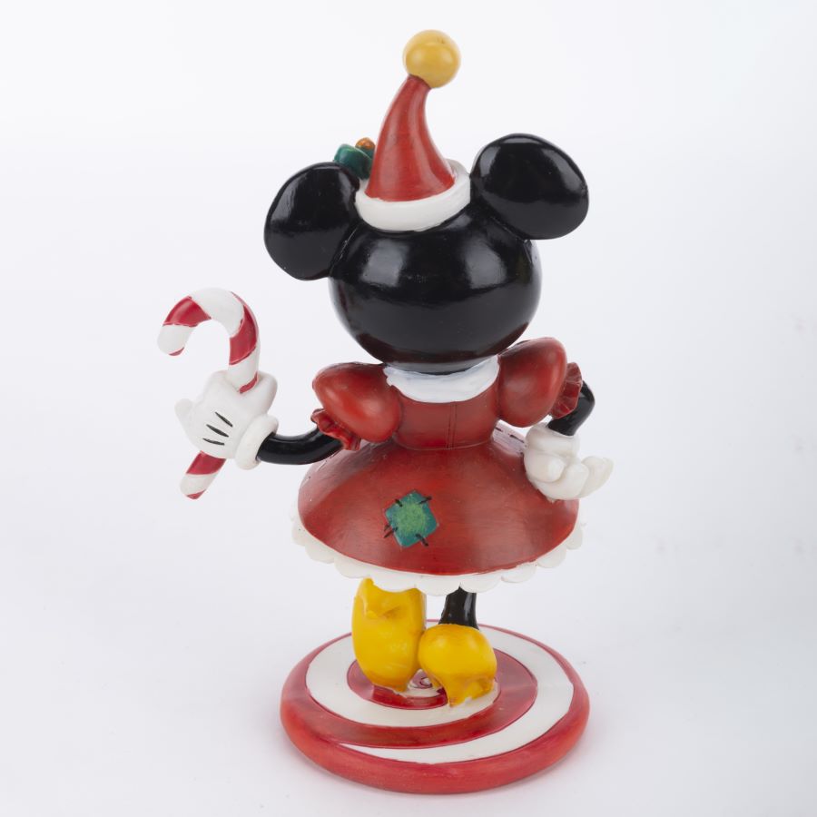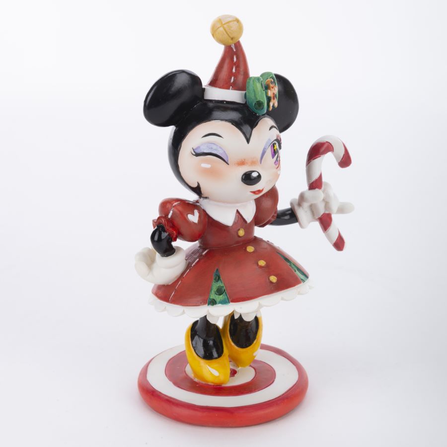 A Disney Showcase Collection figurine of Minnie Mouse with a candy cane and festive holiday clothing. The stone resin figurine was released by Enesco in 2019 as part of the World of Miss Mindy line of figurines. Measuring 3.75”x3” and 6.25” tall, the figurine is in fine as-new condition and comes in the original box.