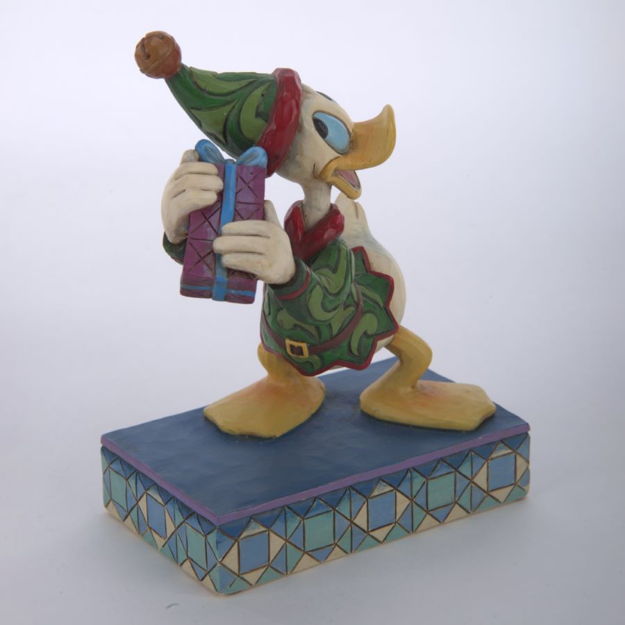 A Disney Traditions figurine of Donald Duck as one of Santa’s little Christmas elf helpers. Titled “Santa’s Curious Helper,” the stone resin figurine was designed by Jim Shore and released by Enesco in 2014 as part of the Disney Showcase Collection. Measuring 4.25”x2.75” and 5.5” tall, the figurine is in fine condition and comes with the original box.