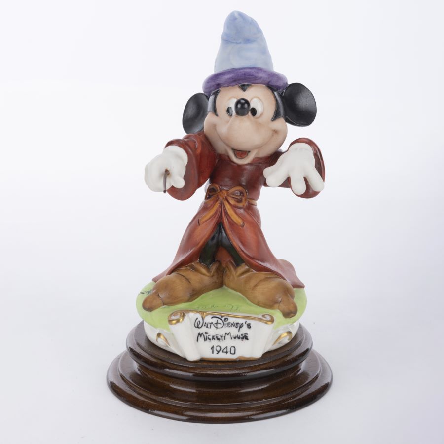 An Italian porcelain figurine inspired by the Disney Studios animated character, Mickey Mouse. Featuring Mickey as he appeared as the Sorcerer’s Apprentice in the 1940 feature “Fantasia, the statuette comes from the "A Walk Through Time with Mickey" series and was sculpted by Enzo Arzenton for the Capodimonte collection. The piece was released in 1988 in an edition of 5000 pieces for Mickey's 60th birthday. Measuring 4.75" in diameter and 7.75" tall, the figurine is in very good condition.