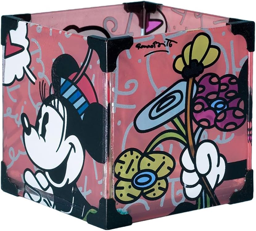A Mickey and Minnie Mouse Votive Candle Holder and Battery-Operated Candle designed by Romero Britto and released in 2011. Measuring 3”x3” and 3” tall, the candle holder is in fine condition and comes with the original box.