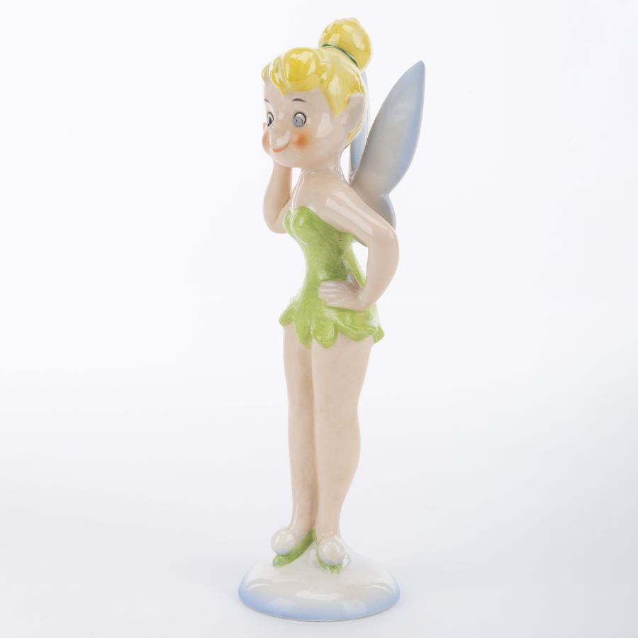 A delicate ceramic figurine of Tinker Bell from the Walt Disney Studios animated classic “Peter Pan.” The figurine was made by Goebel of Germany in 1959. Measuring 2.75”x2.25” and 8.5” tall, the figurine is in very good condition.