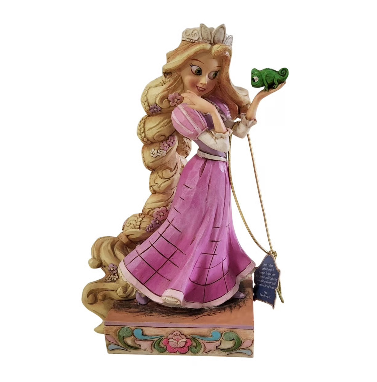 A Disney Traditions figurine of Rapunzel from “Tangled.” Titled “Loyalty and Love,” the stone resin figurine was designed by Jim Shore and released by Enesco in 2013 as part of the Disney Showcase Collection. Measuring 4.75”x3” and 7” tall, the figurine is in fine condition and comes with the original box.