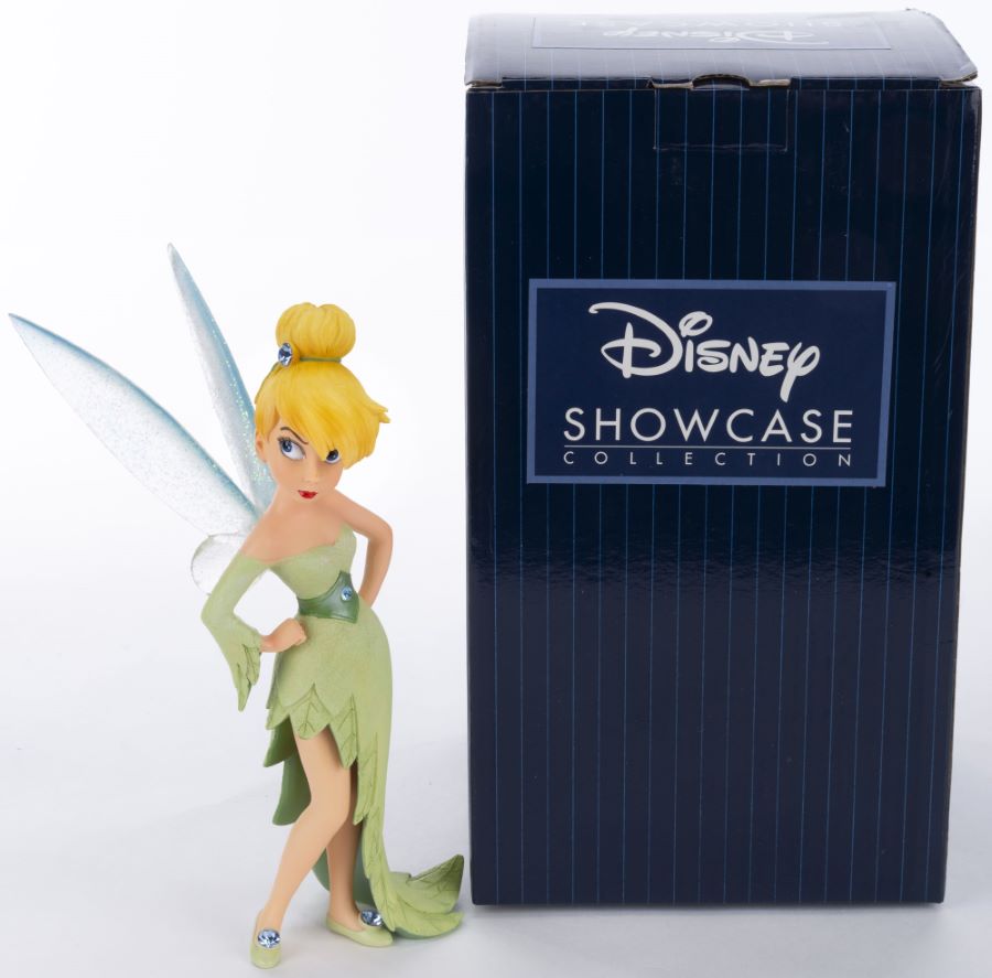 A Disney Showcase Collection figurine of Tinker Bell from “Peter Pan.” The stone resin ‘Couture de Force’ figurine was released in 2021 by Enesco. Measuring 4.25”x3.75” and 7.5” tall, the figurine is in fine condition and comes with the original box.