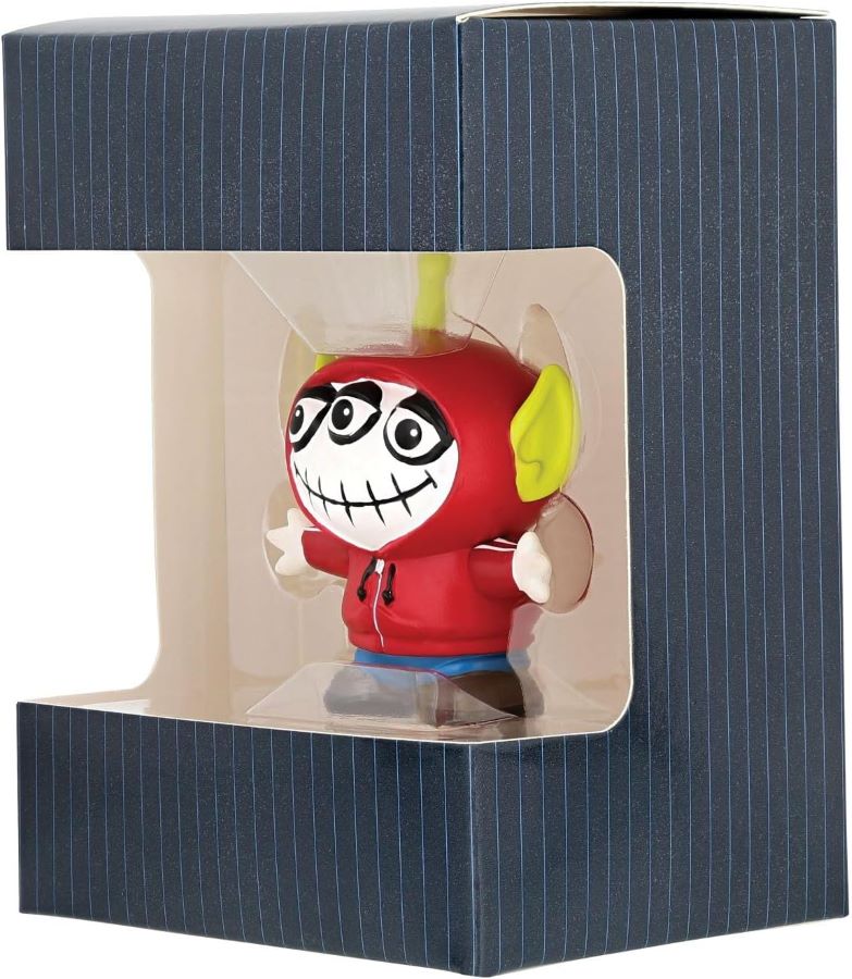 A figurine of a claw machine Martian from the “Toy Story” film series. Featuring the alien dressed Miguel Rivera from “Coco,” the figure was released by Enesco in 2021. Measuring 2.25” tall, the figurine is in very good condition and comes in the original box.
