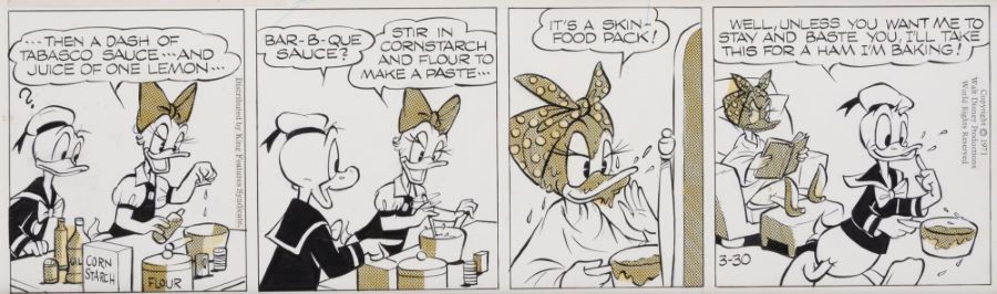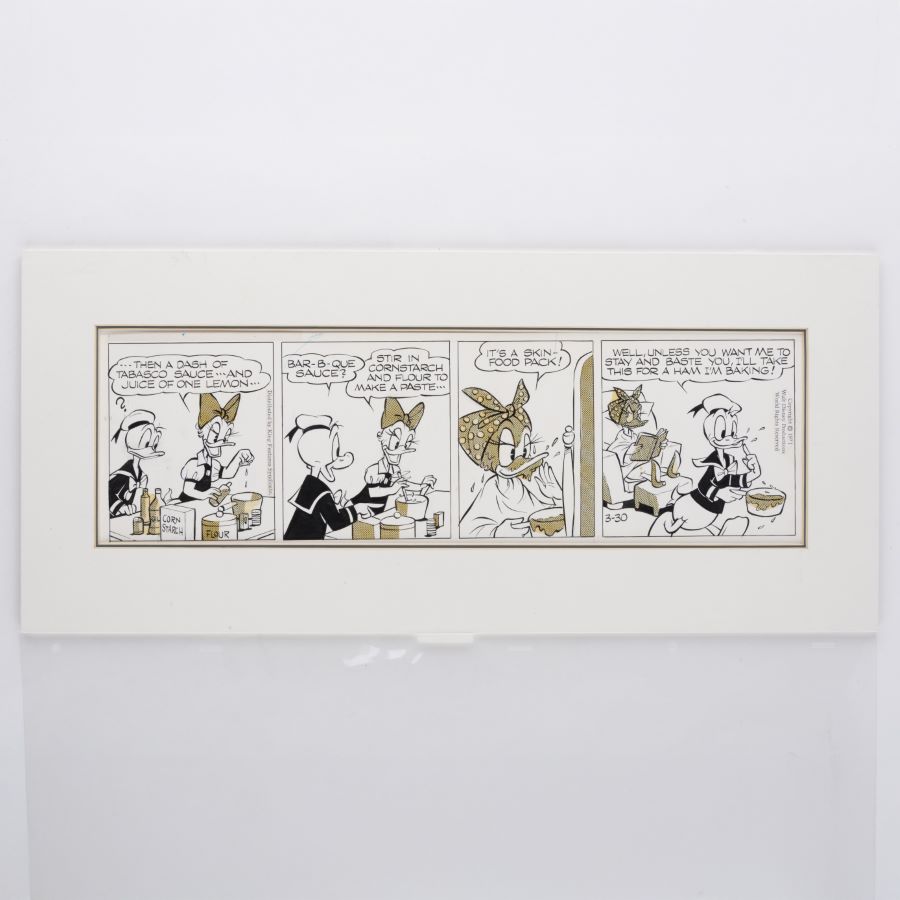 An original Donald Duck Daily Comic Strip (1971) . Featuring a comical interaction with Daisy and Donald, the comic strip take a light hearted jab at the domestic practice of making facial masks and how similar they are to food recipes. Measuring 9.5”x 22.25” matted with the illustrated image area measuring 5”x17.75”, the comic art is in very good condition and has not been inspected outside matting. There is slight discoloration, surface wear, and adhesive tape on the matting.