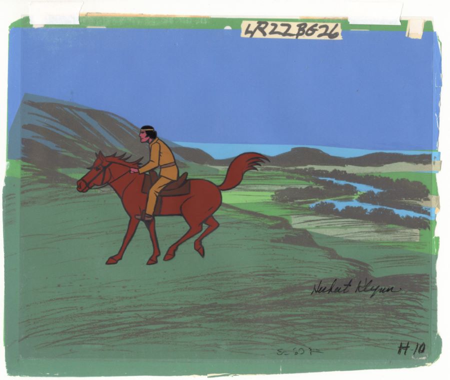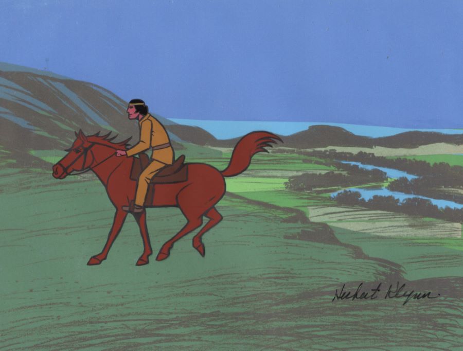 A production cel from the Format Studios animated series “The Lone Ranger” (1966-1968). Featuring Tonto riding Scout, the hand-painted cel was created at the studio and used during the animation process. The piece is an actual frame of animation that was photographed and appears in the series. The cel is also hand-signed by producer Herb Klynn. Measuring 10.25"x12.5" overall with an image measuring 7"x4.75", the cel is in very good condition condition and is paired with a color copy reproduction background.
