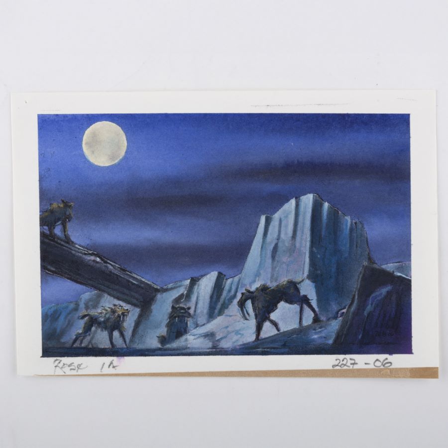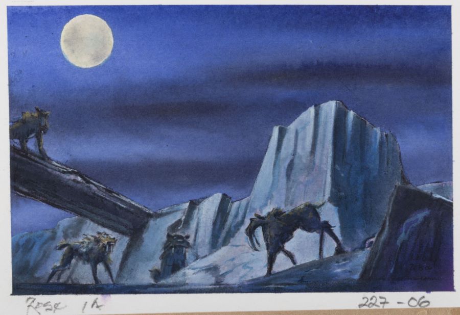 A concept painting from the Fox Studios animated film “Ice Age” (2002). Featuring a moonlit scene with the Sabretoothed Tigers, the painting was created at the studio and used during the animation process. This painting was created by studio concept artist Michael Rose, and the painting is hand-signed by the artist below the imagery. Concept imagery is created early in development to suggest and finalize the general layout, color palette, and characters present in a film’s scene. Measuring 4.75”x7” overall, with the image area measuring 4”x6”, the concept painting is in very good condition with light edge wear, pin holes in the corners, and tape along the bottom edge.