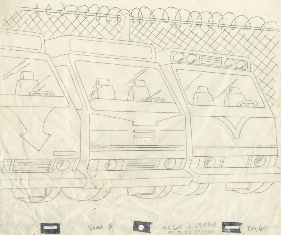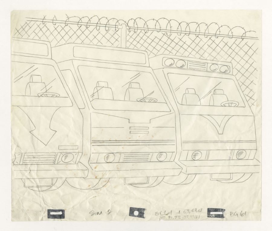 A background layout drawing from the Fox Studios animated television series “The Simpsons” (1987-present). Featuring a lineup of RVs that Homer dreams he could own to rival Flanders’ RV, the drawing is from the season 1 episode “The Call of the Simpsons” (1990), and was used during the animation process. Measuring 10.5"x12.5" overall with the image filling the entire page, the layout drawing is in fair condition with wrinkling and creasing throughout, most notably on the bottom left, and light brown spots.