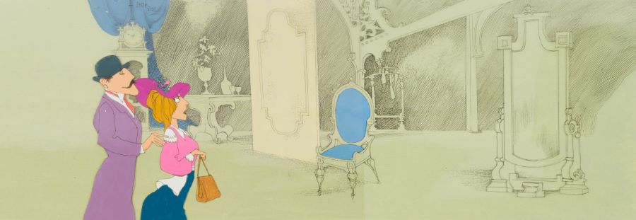 A unique development background for a film adaptation of “The Young Visiters.” Featuring a illustration of an aristocratic man and woman in a sophisticated room, the image was rendered for a project by renowned background artist Paul Julian. Julian is most known for his work on the the Looney Toons cartoons, primarily the Road Runner. The multilayered cel and background was acquired in a collection labeled "The Young Visitors," with documentation including character names and dialogue. We have little information on the project but assume that the background was part of that production. Measuring 10.5"x38.5" overall, with the character image measuring 9.5"x25", the background is in good condition with pin holes in the corners, tape and minor wear due to studio use.