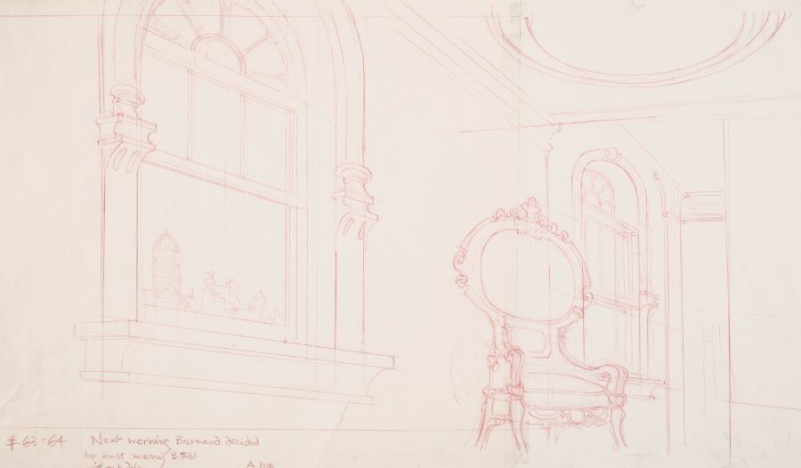 A unique development background for a film adaptation of “The Young Visiters.” Featuring a graphite drawing of a stately room, the image was rendered for a project by renowned background artist Paul Julian. Julian is most known for his work on the the Looney Toons cartoons, primarily the Road Runner. The layout drawing was acquired in a collection labeled "The Young Visitors," with documentation including character names and dialogue. We have little information on the project but assume that the layout drawing was part of that production. Measuring 10.5"x20.5" overall, with the character image measuring 9.5"x13", the background is in very good condition with minor wear due to studio use.