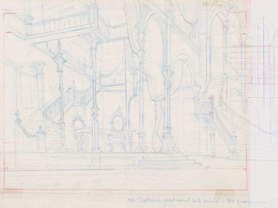 A unique development background for a film adaptation of “The Young Visiters.” Featuring a beautifully detailed graphite drawing of a stately room, the image was rendered for a project by renowned background artist Paul Julian. Julian is most known for his work on the the Looney Toons cartoons, primarily the Road Runner. The layout drawing was acquired in a collection labeled "The Young Visitors," with documentation including character names and dialogue. We have little information on the project but assume that the layout drawing was part of that production. Measuring 11"x23" overall, with the character image measuring 8.5"x13", the background drawing is in very good condition with minor wear due to studio use.