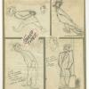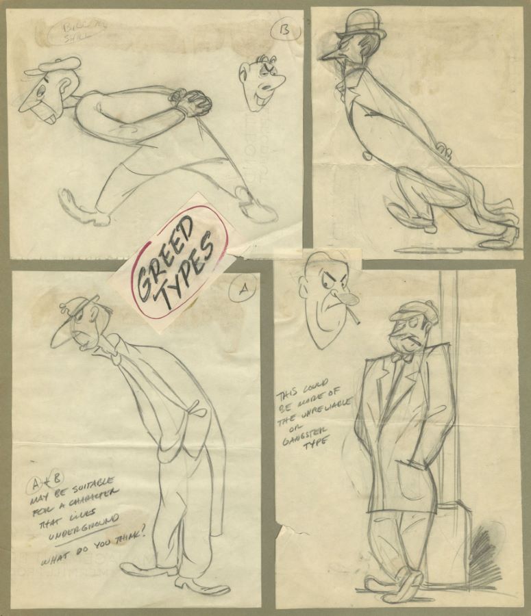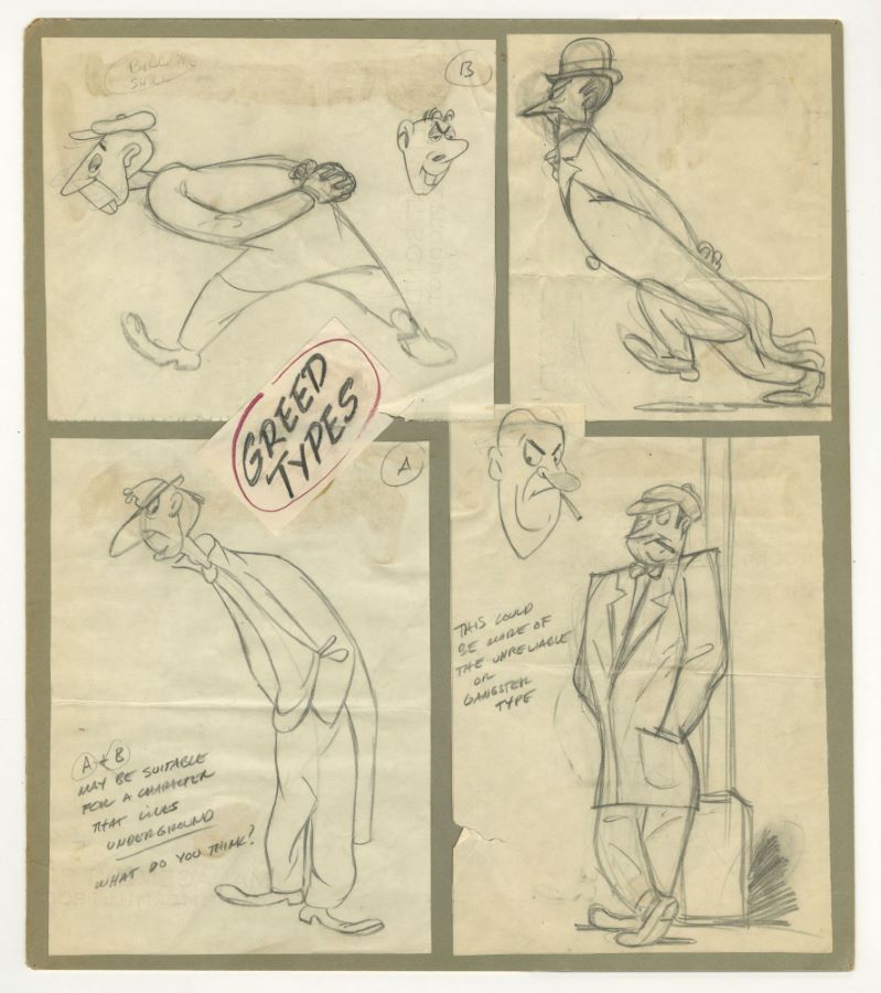 Original concept drawings from an unknown UPA Studios film from the 1950s. Featuring four detailed renderings of "unreliable gangster types," the graphite drawings were created at the studio and used during the animation process. Measuring 16"x14" overall, with the character image area measuring 15.5"x13", the concepts are in very good condition with the four individually trimmed images all adhered to the backing board, with various folds and tears on each piece of paper.