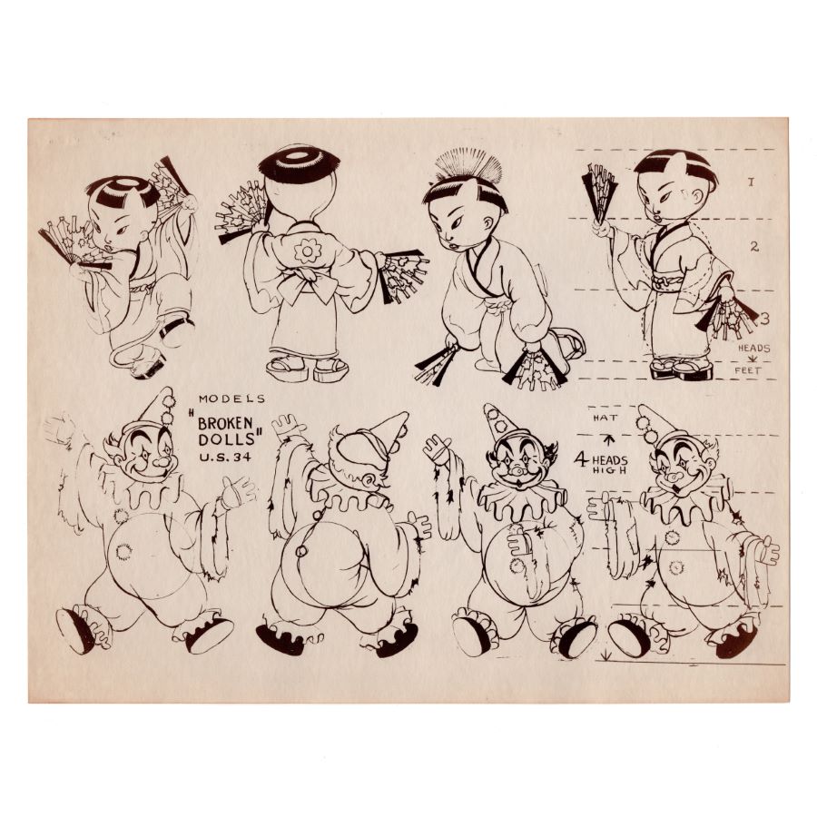 A studio printed model sheet from the Walt Disney Studios animated short "Broken Toys" (1935). Featuring the designs for a geisha doll and rather creepy clown doll, the model sheet was created at the studio and used during the animation process to ensure character consistency among animators. Measuring 10”x13” overall and with the character image measuring 8.75”x12.25”, the model sheet is in very good condition with wear from age and handling including discoloration, edge and corner wear, and staple holes.