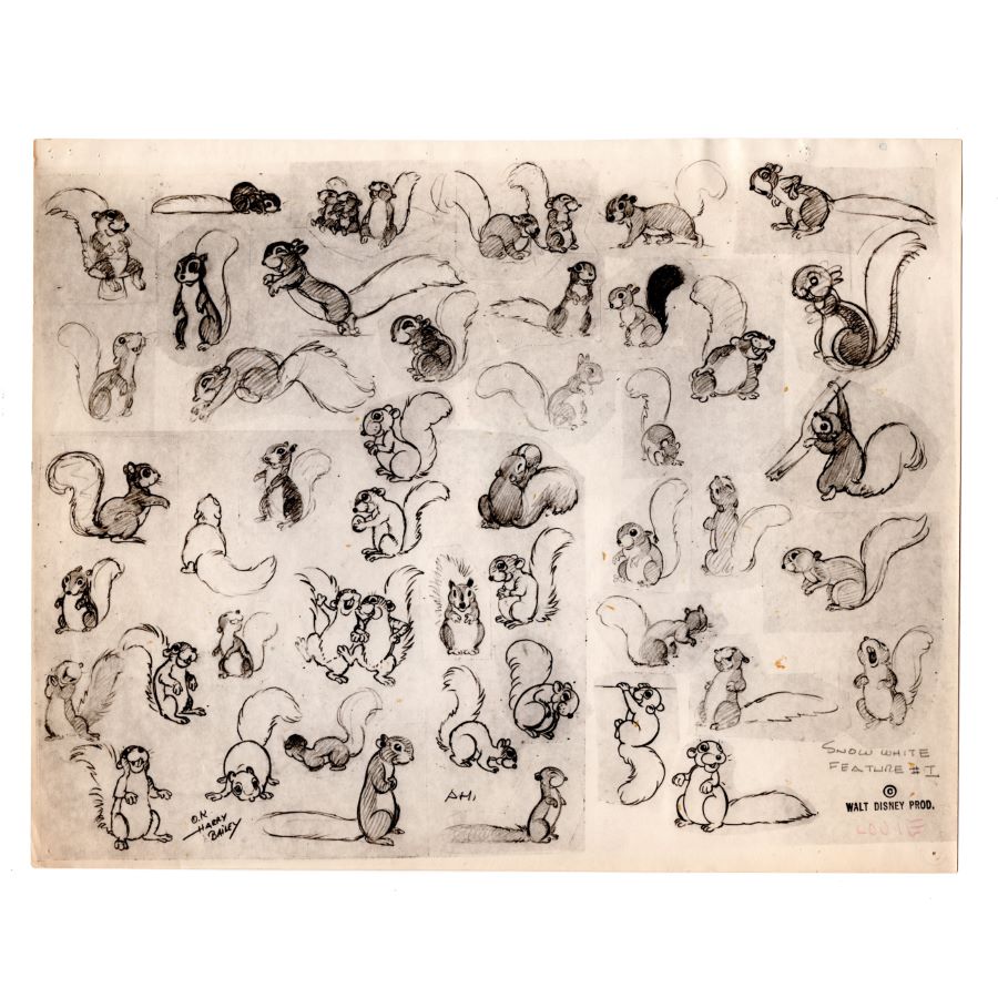 A photostat model sheet from the Walt Disney Studios animated classic "Snow White and the Seven Dwarfs" (1937). Featuring design suggestions for the forest squirrels, the model sheet was created at the studio and used during the animation process to ensure character consistency among animators. Measuring 11”x14” overall, with the image area measuring 10.25”x13.25”, the model sheet is in very good condition with wear from age and handling including discoloration, edge and corner wear, staple and pin holes throughout, and light staining.