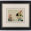 A production cel from the Walt Disney Studios animated film “Pinocchio” (1940). Featuring a charming depiction of Pinocchio talking with a cheerful Jiminy Cricket, the hand-painted cel was created at the studio and used during the animation process. The cel was originally prepared for sale through the Courvoisier Galleries in the early 1940s and exhibits characteristics common with this preparation. The characters are trimmed to image and applied to a custom airbrushed background. Each character cel is an actual frame of animation that was photographed and appears in the movie. Measuring 18.75”x21.25” framed, with the mat opening measuring 7.5”x9.5” and the character images measuring 6.5”x4.5” and 2”x1.75”, the cel setup is in very good condition unexamined out of frame. There is slight curling of the cels visible, which is also common of these Courvoisier setups. The frame has minor wear to the corners and edges.