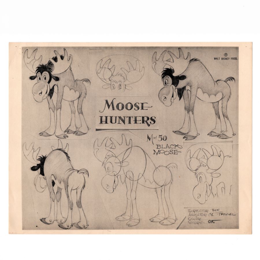 A photostat model sheet from the Walt Disney Studios animated short “Moose Hunters” (1937). Featuring the black moose, the model sheet was created at the studio and used during the animation process to ensure character consistency among animators. Measuring 9.5”x12” overall, with the image area measuring 8.75”x10.25”, the model sheet is in very good condition with wear from age and handling including heavy discoloration, slight edge and corner wear, and various pin holes at the corners.