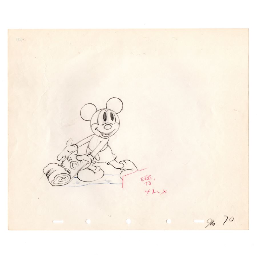 A production drawing from the Walt Disney Studios animated Mickey Mouse short “Society Dog Show” (1939). Featuring Mickey Mouse preparing to doll-up Pluto with a little grooming, the graphite drawing was created at the studio and used during the animation process. The late 1930s design of Mickey is a modernized model that more closely resembles the Mickey that we know today. Measuring 10”x12” overall, with the character image measuring 4.25”x4.5”, the drawing is in very good condition with minor discoloration from age and light handling related creases and edge wear.