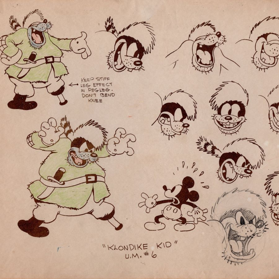 A studio printed model sheet from the Walt Disney Studios animated short "The Klondike Kid" (1932). Featuring the main design and facial expressions of Peg Leg Pete with one attacking Mickey, the model sheet was created at the studio and used during the animation process to ensure character consistency among animators. Measuring 9.5”x12” overall and with the character image measuring 8.5”x10.5”, the model sheet is in very good condition with wear from age and handling including discoloration, edge and corner wear, and staple and pin holes. The two left images have been hand colored and an additional Pete expression is hand drawn in the lower right corner.