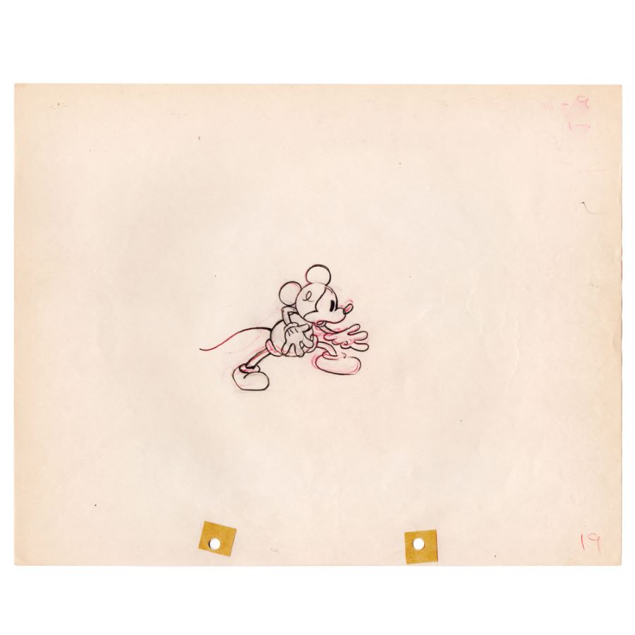 A production drawing from the Walt Disney Studios animated Mickey Mouse short “The Mad Doctor” (1933). Featuring a shocked and concerned image of Mickey Mouse in his earlier 1930s model, the graphite drawing was created at the studio and used during the animation process. Measuring 9.5”x12” overall, with the character image measuring 2.5”x3.25”, the drawing is in very good condition with minor wear from age and handling including discoloration and edge and corner wear throughout.