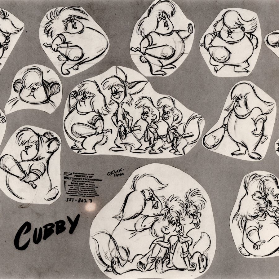 A photostat model sheet from the Walt Disney Studios animated film “Peter Pan” (1953). Featuring Cubby with additional images of the other Lost Boys, the model sheet was created at the studio and used during the animation process to ensure character consistency among animators. Measuring 11”x14” overall, with the image area measuring 9”x13”, the model sheet is in very good condition with wear from age and handling including discoloration, light edge and corner wear, and small pin holes and red staining at the top right corner.