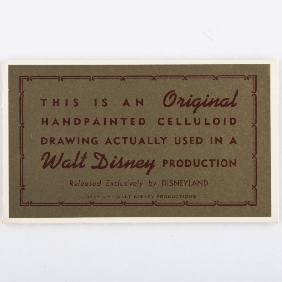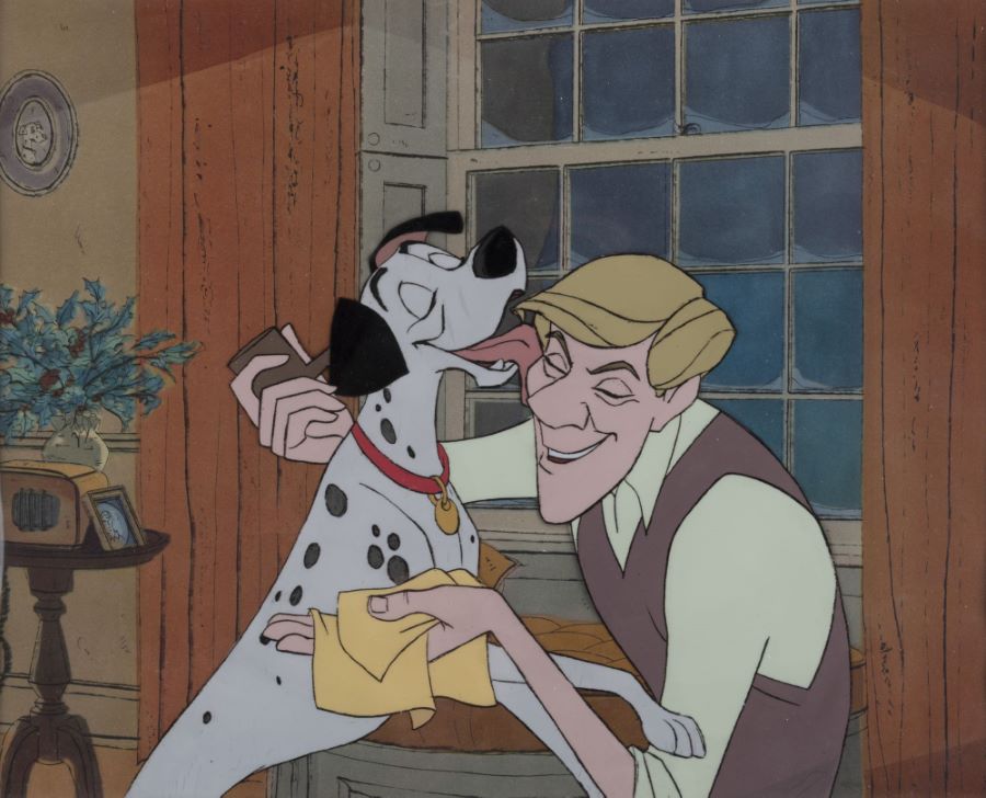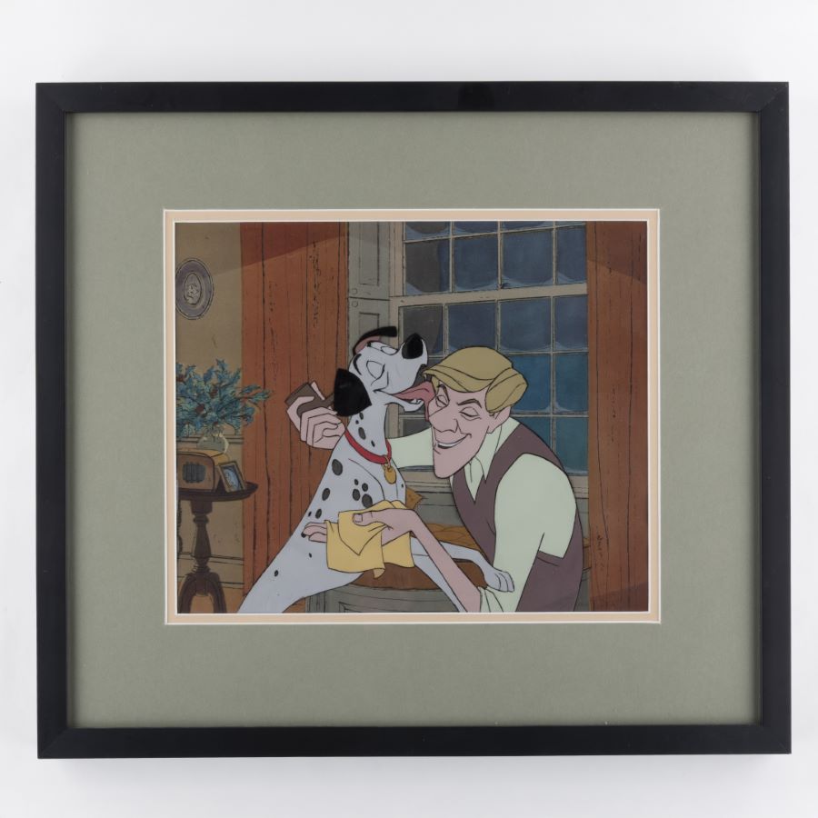 A production cel from the Walt Disney Studios animated film “101 Dalmatians” (1961). Featuring Pongo lovingly licking Roger’s face, the hand-painted cel was created at the studio and used during the animation process. The piece is an actual frame of animation that was photographed and appears in the movie. Measuring 16.5”x18.5” framed, with mat window measuring 9.5”x11.75” and the character image measuring 7”x8.5”, the cel is in very good condition unexamined out of the frame with minor areas of paint lifting and cracking, slight rippling, and the frame has some wear from age and handling.