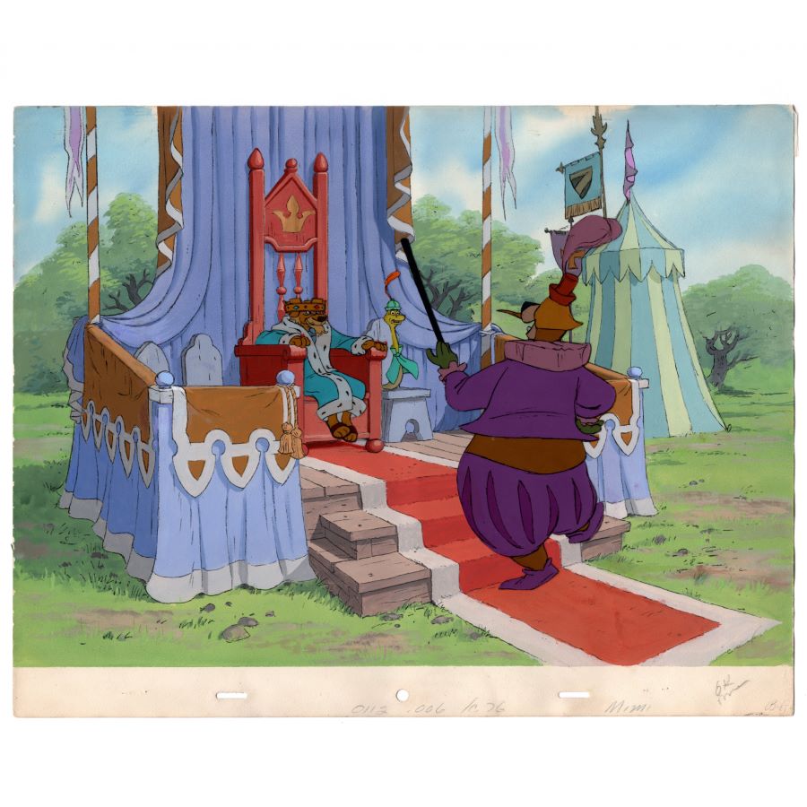 A stunning key-master cel and background setup from the Walt Disney Studios animated film “Robin Hood” (1973). Featuring Little John in disguise approaching Prince John and Sir Hiss at the archery tournament, the hand-painted setup was created at the studio and used during the animation process. The characters have been meticulously trimmed from their original cel layers and applied to the matching hand-painted background. The cel of Little John has been intentionally positioned lower on the stairs to avoid covering Sir Hiss, as he is in the film. Measuring 12.5”x16” overall, with the character image area measuring 7.5”x7.25”, the setup is in very good condition with minimal surface and edge wear. The trimmed and applied setup was done at the studio, as was customarily done as a gift for special circumstances.