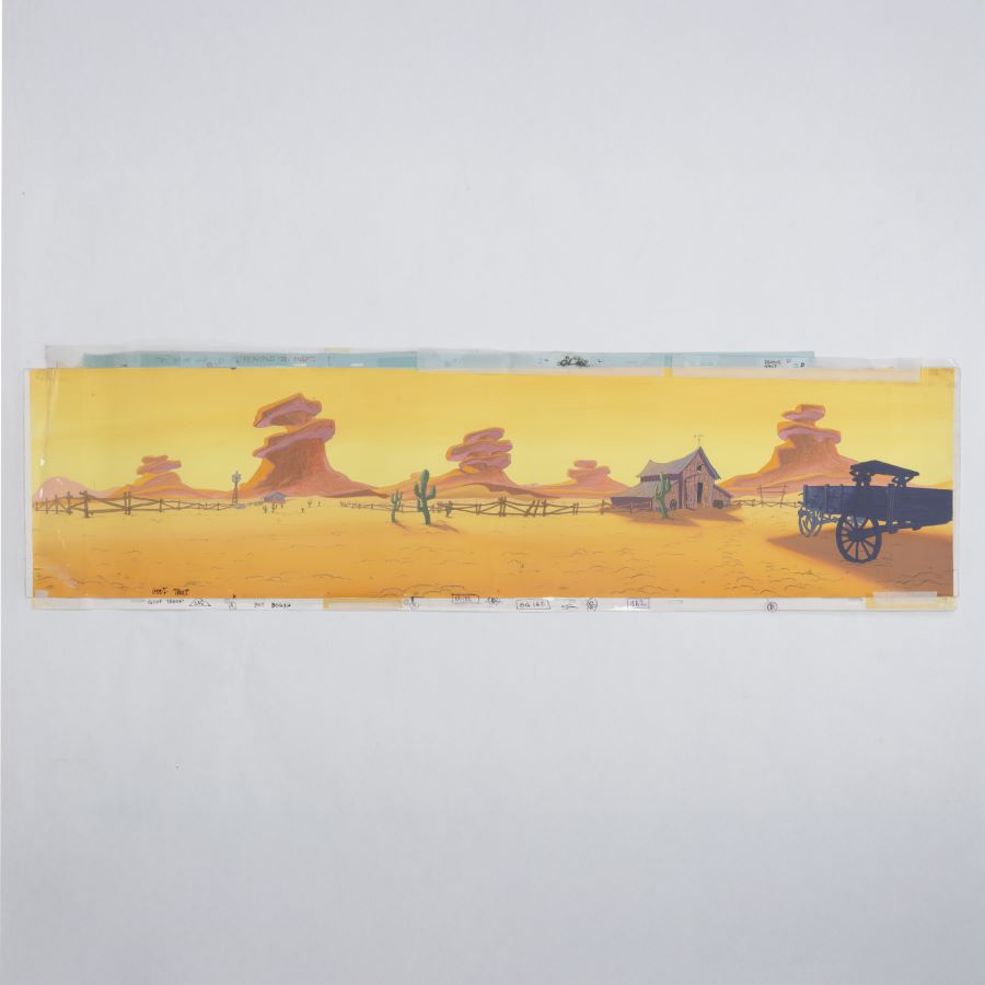 A production background from the Walt Disney Studios animated series “Goof Troop” (1992). Featuring a long desert landscape, the hand-painted background was created at the studio and used during the animation process. The piece is an actual frame of animation that was photographed and appears in the series. Measuring 11.5”x41.5” overall, with the image area measuring 10.25”x41”, the background is in very good condition with minor minor surface and edge wear, visible vertical creasing at middle-right area, and minor rippling/warping from studio use and handling.