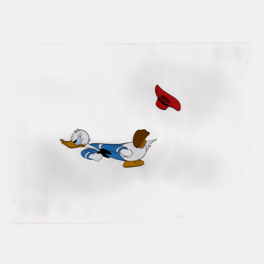 A production cel from the Walt Disney Studios animated Donald Duck short “Beezy Bear“ (1955). Featuring Donald Duck looking frustrated as he tries to prevent Ranger Woodlore and Humphrey Bear from stealing his honey, the hand-painted cel was created at the studio and used during the animation process. The piece is an actual frame of animation that was photographed and appears in the cartoon. Measuring 16”x20” matted, with the mat opening measuring 7.5”x11.5” and the character image measuring 5.5”x8.25”, the cel is in very good condition with a little bit of paint lifting in the hat and the right edge and lower right corner of the cel is roughly trimmed.