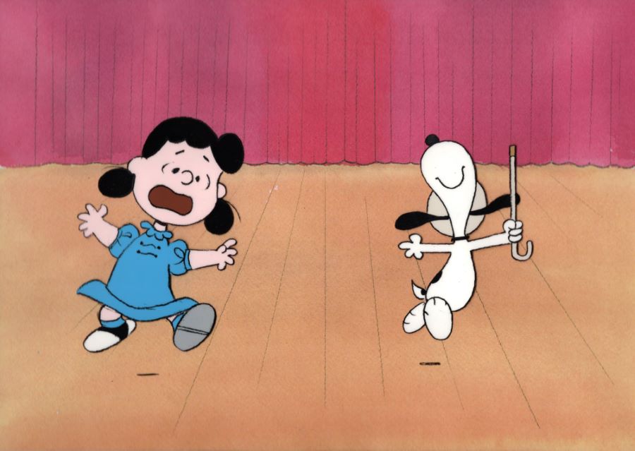 An original Charles Schulz sketch and production cel from the Bill Melendez Studios animated “Peanuts” series (c.1980s). Featuring Lucy and Snoopy dancing together, the hand-painted cel was created at the studio and used during the animation process. The piece is an actual frame of animation that was photographed and appears in the cartoon. The drawing is a small sketch of Lucy that is hand-drawn and signed by the creator of “Peanuts,” Charles Schulz. Measuring 18.25”x17.5” matted, the mat has openings measuring 8.5”x12” for the cel and 2.75”x4” for the sketch. The character image measures 4.5”x8.5” on the cel and 2.25”x1.75” on the sketch. The piece is in very good condition unexamined out of the mat and the cel is paired with a printed reproduction background.