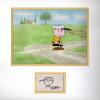 An original Charles Schulz sketch and production cel from the Bill Melendez Studios animated “Peanuts” series (c.1980s). Featuring Charlie Brown looking rather dejected while wearing his baseball cap, the hand-painted cel was created at the studio and used during the animation process. The piece is an actual frame of animation that was photographed and appears in a cartoon. The drawing is a small sketch of Charlie that is hand-drawn and signed by the creator of “Peanuts,” Charles Schulz. Measuring 18.5”x18” matted, with the mat openings measuring 8.5”x11.25” for the cel and 2.75”x4.5” for the sketch. The character image measures 4”x3” on the cel and 2”x3.25” on the sketch. The piece is in very good condition unexamined out of the mat and the cel is paired with a printed reproduction background.