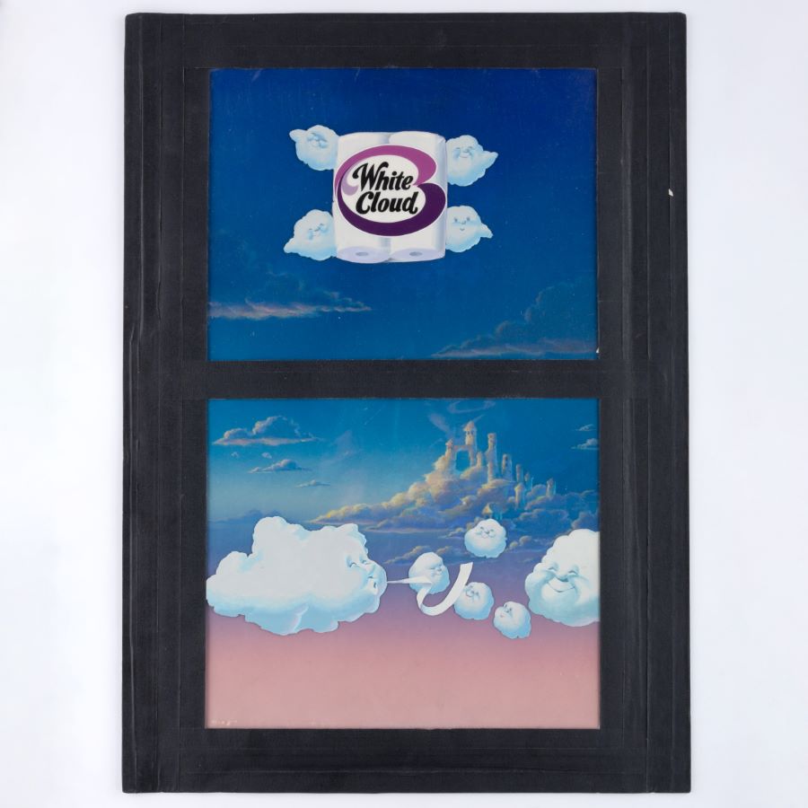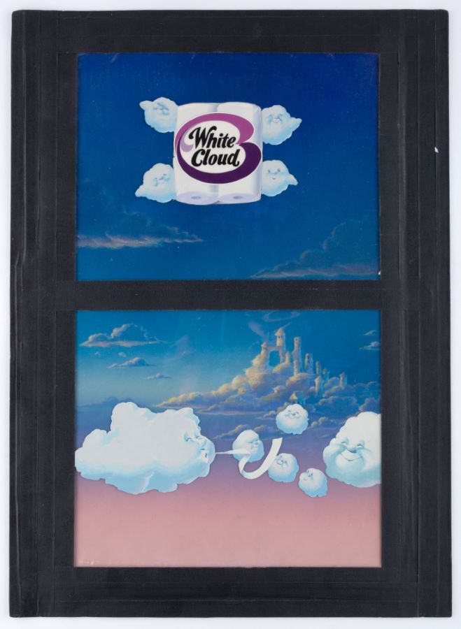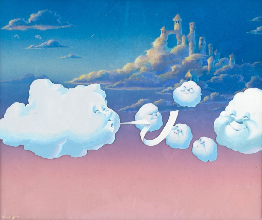 A pair of production cel and background setups from an animated commercial for White Cloud Toilet Paper (c.1981). Featuring the company’s logo packaging and a group of clouds creating toilet paper as soft as they are, the setups were created at the studio and used during the animation process. Each piece is an actual frame of animation that was photographed and appears in a commercial. The two setups are attached to a mat backing board with black tape creating borders. Measuring 22.5"x16.5" overall on the backing board, with the upper opening measuring 8.5"x11.25" and the lower opening measuring 9.5"x11.25", the setups are in very good condition with minor surface wear and dirt.