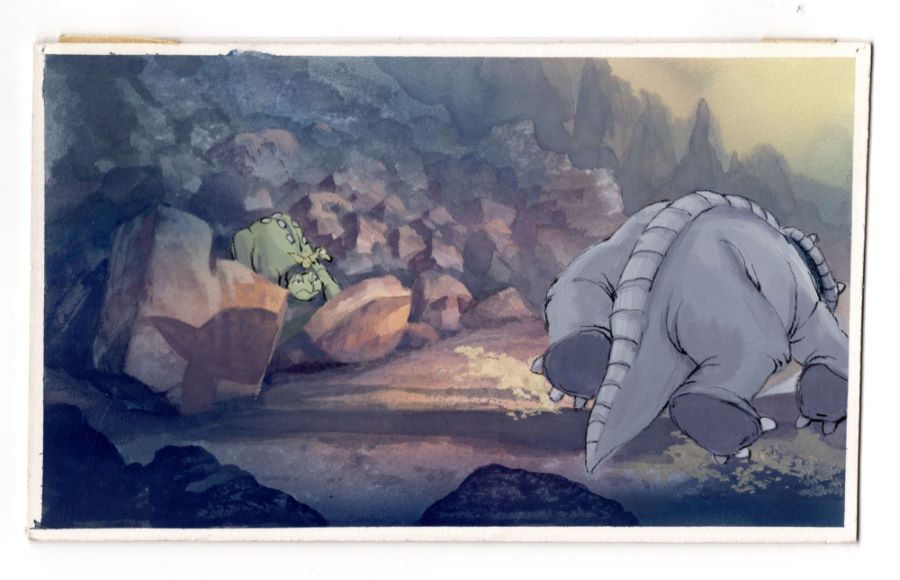 A background color key concept painting from the Don Bluth Studios production of "The Land Before Time" (1988). Featuring Cera, Ducky, and Spike walking through the valley amidst the rocky cliffs, the hand-painted concept was created at the studio and used during the early production of the film. The concept was used to develop and finalize the color palette for the scene, the layout of the action, and the overall feel of the scene. When a color concept is finalized during production, it becomes the reference tool that animators would use to paint cels and backgrounds, as well as to further progress through the storyboarding and layout of the individual scenes. Measuring 4.5"x7.5" overall, the concept is in fine condition.