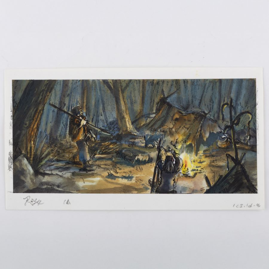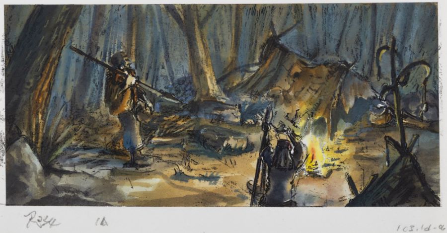 A concept painting from the Fox Studios animated film “Ice Age” (2002). Featuring a human tribe making camp with a fire and tent, the painting was created at the studio and used during the animation process. This painting was created by studio concept artist Michael Rose, and the painting is hand-signed by the artist below the imagery. Concept imagery is created early in development to suggest and finalize the general layout, color palette, and characters present in a film’s scene. Measuring 4.5”x8” overall, with the image area measuring 3.5”x7.5”, the concept painting is in very good condition with light edge wear and discoloration along the upper edge.