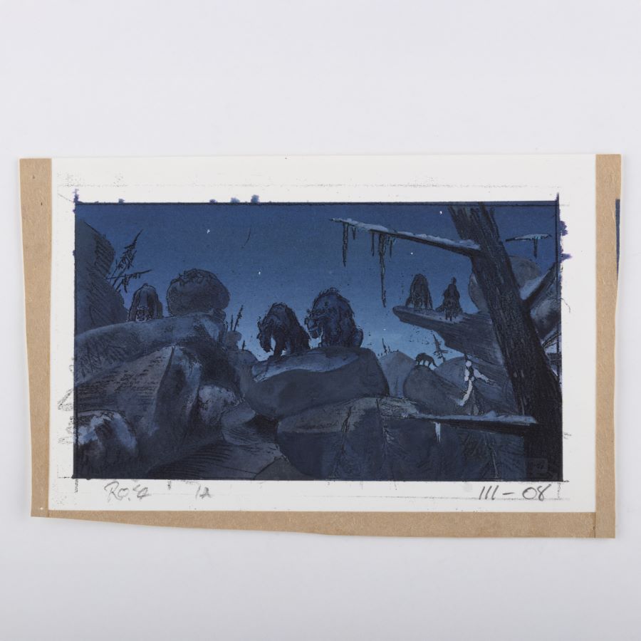 A concept painting from the Fox Studios animated film “Ice Age” (2002). Featuring the Sabretoothed Tigers perched on the rocks with the night sky behind them, the painting was created at the studio and used during the animation process. This painting was created by studio concept artist Michael Rose, and the painting is hand-signed by the artist below the imagery. Concept imagery is created early in development to suggest and finalize the general layout, color palette, and characters present in a film’s scene. Measuring 4.75”x7.75” overall, with the image area measuring 3.75”x6.5”, the concept painting is in very good condition with light edge wear, pin holes in the corners, and tape along the edges.