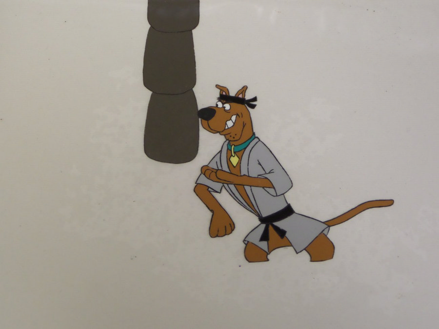 An original production cel from the Hanna Barbera Studios animated series Scooby-Doo, Where Are You! (1969-1970). Featuring Scooby practicing karate, the hand-painted cel was created at the studio and used during the animation process. The piece represents an actual frame of animation that was photographed and appears in a cartoon. Measuring 10.5"x12.5" overall, and with the character image measuring 7.25"x6.25", the production cel is in very good condition with minor line wear.