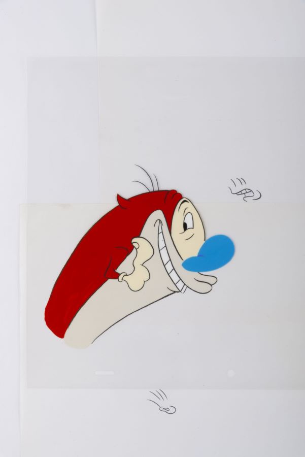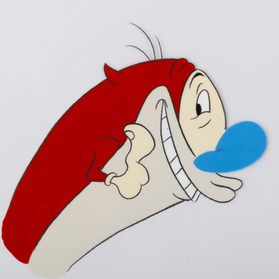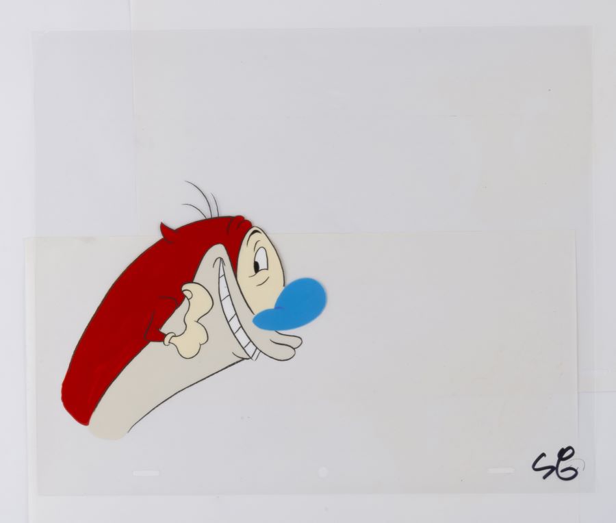 A production cel from the Nickelodeon Studios animated series “The Ren & Stimpy Show” (1991-1996). Featuring Stimpy grinning gleefully, the hand-painted cel was created at the studio and used during the animation process. The cel is an actual frame of animation that was photographed and appears in the episode titled “Reverend Jack,” which aired on December 9, 1995. Measuring 10.5”x12.5” overall, with a character image size of 5.25”x5.5”, the cel is in very good condition with light scratches, and minimal paint and black line fade.