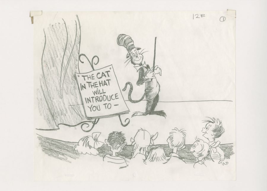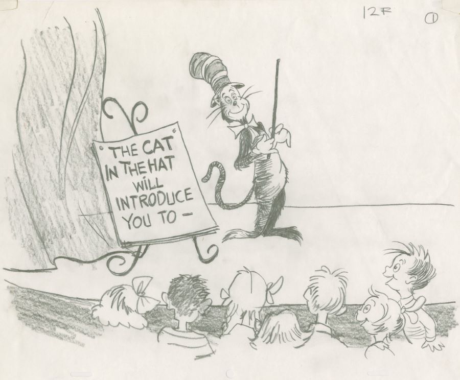 A layout drawing from the Ralph Bakshi Studios animated short "The Butter Battle Book" (1989). Featuring a fantastic image of the Cat in the Hat on a stage in front of a group of children, the graphite drawing was created at the studio and used during the animation process of the adaptation of the Dr. Seuss book of the same name. The drawing appears to be from an interstitial segment introducing the upcoming cartoon. Measuring 10.5"x12.5" overall, with the character image measuring 9.25"x12", the drawing is in very good condition with minor edge wear, discoloration, and a horizontal crease across the sheet.