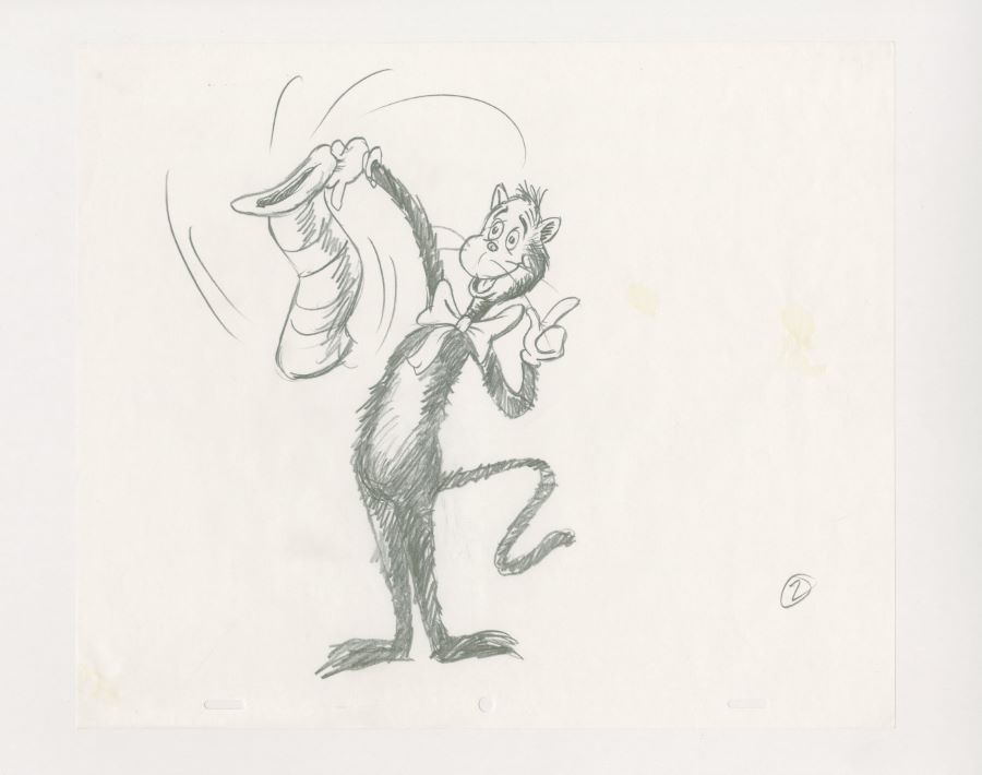 A layout drawing from the Ralph Bakshi Studios animated short "The Butter Battle Book" (1989). Featuring a fantastic image of the Cat in the Hat taking off his hat, the graphite drawing was created at the studio and used during the animation process of the adaptation of the Dr. Seuss book of the same name. It appears to be from an interstitial segment introducing the upcoming cartoon. Measuring 10.5"x12.5" overall, with the character image measuring 8.25”x5.5", the drawing is in very good condition with minor wear from age and handling including edge wear, discoloration, two stains on the right side, and a stain on the bottom left corner.