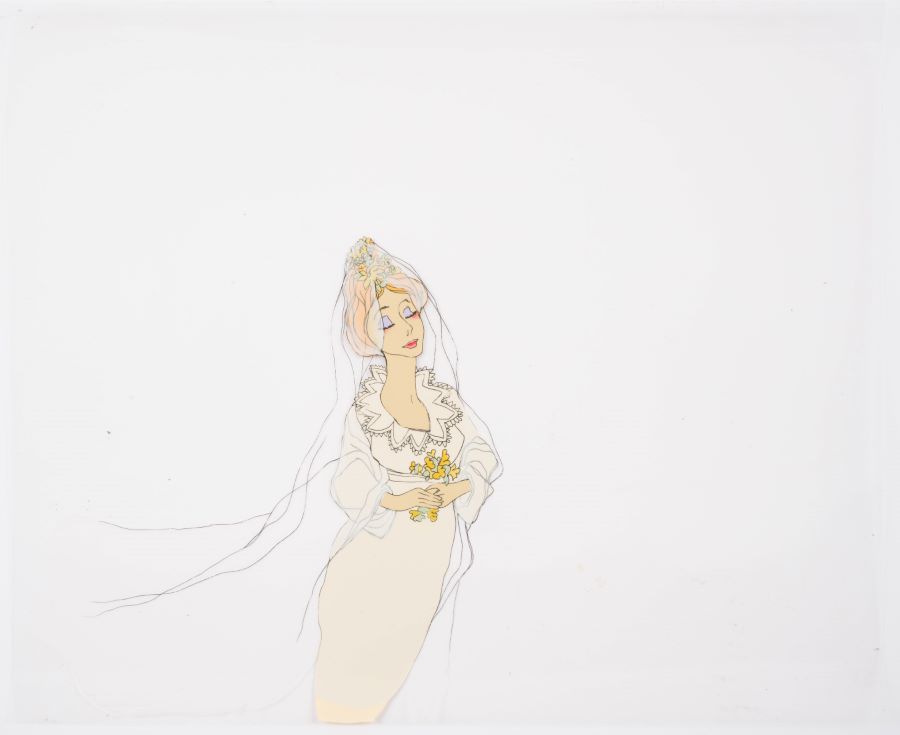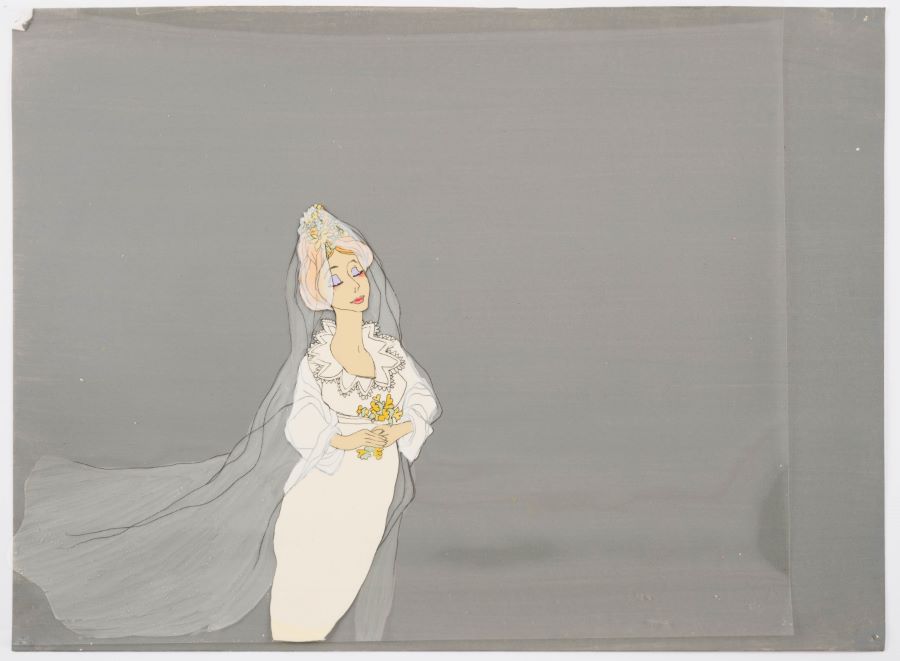A unique development background for a film adaptation of “The Young Visiters.” Featuring an illustration of a young lady in a wedding gown amongst a plain grey backdrop, the painting was rendered for a project by renowned background artist Paul Julian. Julian is most known for his work on the Looney Toons cartoons, primarily the Road Runner. The multilayered cel and background was acquired in a collection labeled "The Young Visitors," with documentation including character names and dialogue. We have little information on the project but assume that the background was part of that production. Measuring 13.5"x18" overall, with the character image measuring 9.5"x8.5", the background is in good condition with a slightly curled left corner, and white paint residue from the cel onto the grey background.