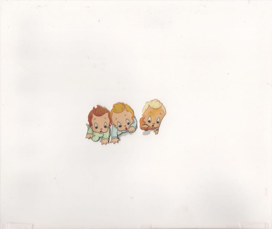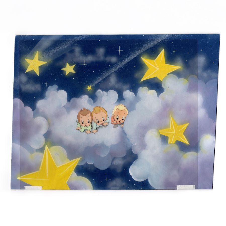 A production cel from the Walt Disney Studios animated short “Wynken, Blynken and Nod” (1938). Featuring all three of the main characters, the hand-painted cel was created at the studio and used during the animation process. The piece is an actual frame of animation that was photographed and appears in the cartoon. The character cel was trimmed to image, applied to a blank cel layer, and paired with a custom painted reproduction background. Measuring 11”x14.25” overall, with the trimmed to image characters measuring 2.25”x3.5”, the cel is in very good condition with slight curling to the edges of the cel and minimal edge wear on the overall setup.