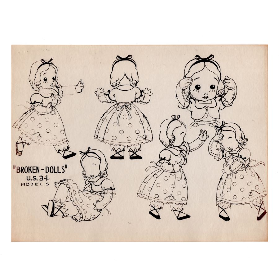 A studio printed model sheet from the Walt Disney Studios animated short "Broken Toys" (1935). Featuring the blind girl doll, the model sheet was created at the studio and used during the animation process to ensure character consistency among animators. Measuring 10”x13” overall and with the character image measuring 8.5”x12.75”, the model sheet is in very good condition with wear from age and handling including discoloration, edge and corner wear, and staple holes.