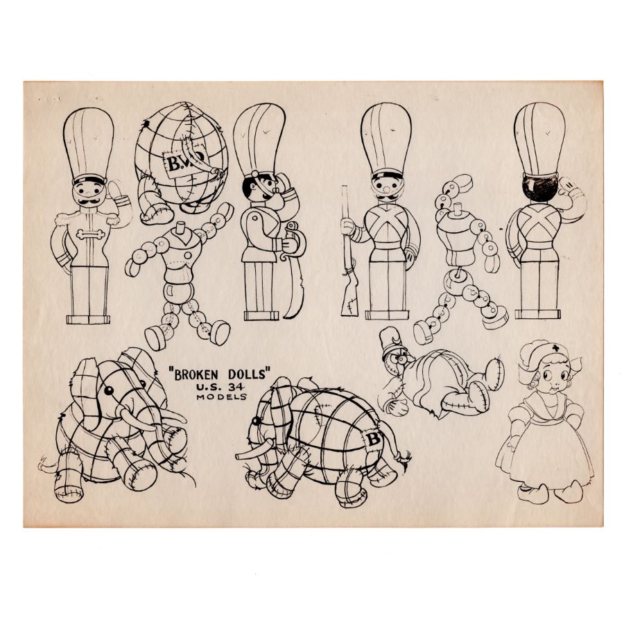 A studio printed model sheet from the Walt Disney Studios animated short "Broken Toys" (1935). Featuring the toy soldier, nurse doll, and stuffed elephant, the model sheet was created at the studio and used during the animation process to ensure character consistency among animators. Measuring 10”x13” overall and with the character image measuring 9.25”x12”, the model sheet is in very good condition with wear from age and handling including discoloration, edge and corner wear, and staple holes.