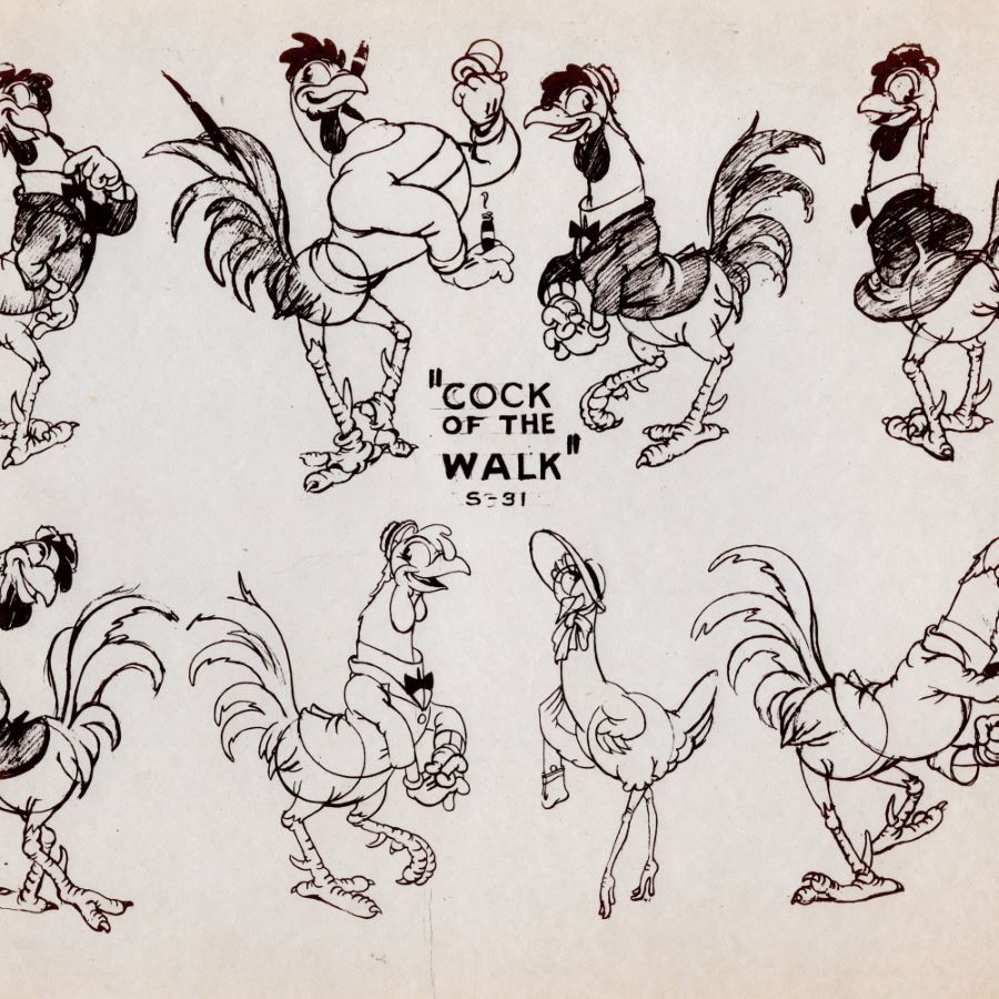 A studio printed model sheet from the Walt Disney Studios animated short "Cock O’ the Walk" (1935). Featuring the titular character Cock O’ the Walk and his love interest Prunella Pullet, the model sheet was created at the studio and used during the animation process to ensure character consistency among animators. Measuring 9.5”x13.5” overall and with the character image measuring 8.5”x11.5”, the model sheet is in very good condition with wear from age and handling including discoloration, edge and corner wear, and staple holes.