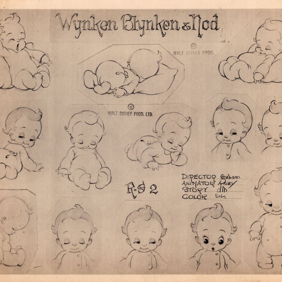 A studio printed model sheet from the Walt Disney Studios animated short "Wynken, Blynken, and Nod" (1938). Featuring the standard designs for the sleepy children, the model sheet was created at the studio and used during the animation process to ensure character consistency among animators. Measuring 10”x12” overall and with the character image measuring 9”x11.5”, the model sheet is in very good condition with wear from age and handling including discoloration, edge and corner wear, and staple holes.
