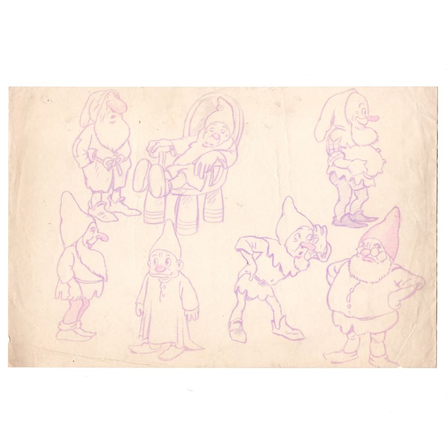 A studio printed model sheet from the Walt Disney Studios animated classic "Snow White and the Seven Dwarfs" (1937). Featuring Albert Hurter suggestions for the Dwarfs, the model sheet was created at the studio and used during the animation process to develop the final characters. Dozens of names were suggested for the dwarfs, with some being designed and not making it into the final film. This sheet includes Deafy and Baldy who were replaced by Bashful and Sneezy. Measuring 8.5”x13” overall, with the image area measuring 8.5”x11”, the model sheet is in very good condition with wear from age and handling including discoloration, edge and corner wear, and staple holes.