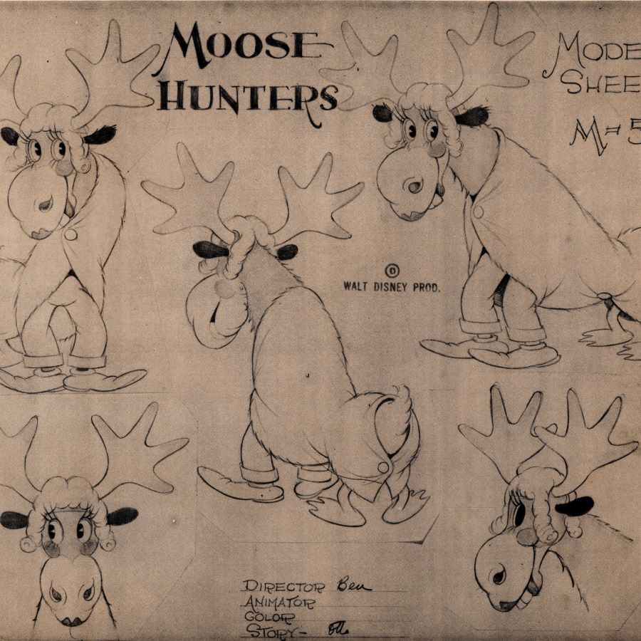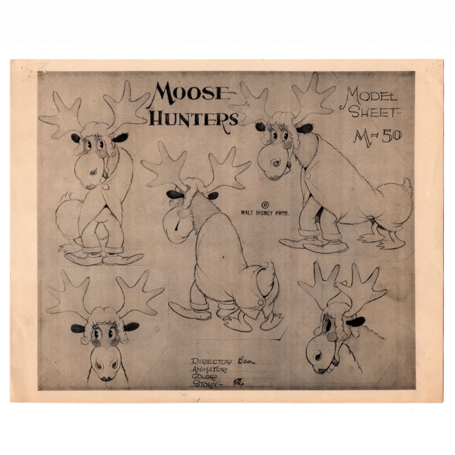 A photostat model sheet from the Walt Disney Studios animated short “Moose Hunters” (1937). Featuring Donald Duck and Goofy in their moose disguise, the model sheet was created at the studio and used during the animation process to ensure character consistency among animators. Measuring 9.5”x12” overall, with the image area measuring 8.5”x10”, the model sheet is in very good condition with wear from age and handling including discoloration, slight edge and corner wear, and various pin holes at top corners.